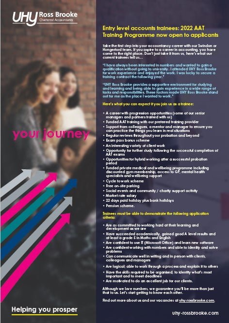 By securing work experience at UHY Ross Brooke prior to my employment I could tell it was a good working environment. I learned that UHY Ross Brooke has a varied client base, from tiny subcontractors to larger corporate firms. This gives you exposure to all types of industries as well as being involved in different aspects throughout the firm, eg VAT, Accounts, Tax and Payroll.